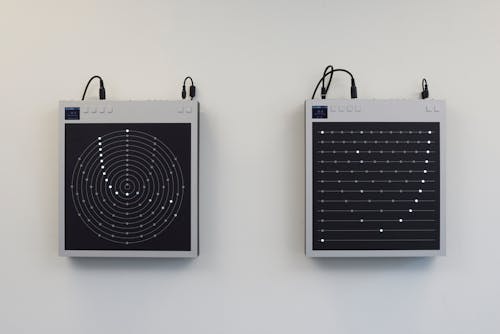 The embassy building was completed in 1959, designed by Marcel Breuer. Erek draws on this period by taking inspiration and sound samples from an early drum-machine, the Wurlitzer Sideman, developed in the same years. “Ꜵccident Grotesque,” written with a specially designed Ꜵ-ligature, refers to the history of the architectural design by Breuer, during the height of modernism and economic optimism. The ligature gains additional resonance, allowing to shift between vowel sounds and between accident and occident, two words that trace back to the Latin root cadere (to fall), with occident, referring to the setting of the sun. Erek uses the ligature to reference the West and the paradoxes of progress and power. The exhibition’s works – Fluctuations of Raw Techno Material (2024) and Day (2014) – introduce multiple timing systems within the former embassy building in which each floor plays its own rhythmic role.