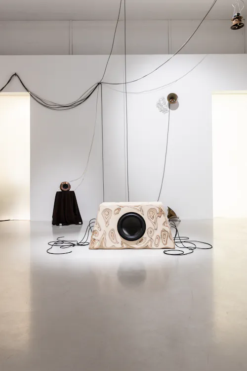 What's left speaks is an immersive sound installation by spatial designer Felix Bell, visual artist and researcher Gaia D’Arrigo, and composer Nuno Lobo that imagines speakers as chimeric creatures emerging from the remnants of a post-human environment. The creature-like sculptures are scattered throughout the space, both hanging from the ceiling and emerging from the ground with cables as veins, decayed components as organs, and supports acting as skeletons. Vocal sounds resonate from these speaker-bodies – fragmentary, pulsating, and whispery yet unmistakably human. Playing in the dichotomies between recognition and alienation and between the human and more-than-human, the installation takes as its central idea the need for humans to seek a sense of community within detached technological societies.