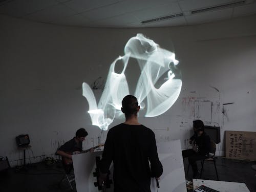 During their live performance the duo interacts with the performative visuals of Felix Bodin, using his self-designed visual instrument, consisting of projections reverberated through the performance space with the use of a malleable mirrored surface.