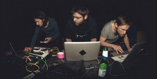 The Void Pointers are Roald van Dillewijn, Tijs Ham and Eric Magnée. Modifying instruments for improvised acousmatic music is the band’s forte, and an incredibly diverse one; from modifying guitars and flutes, to setting up a six piece ensemble for string and electronics. During their performances, The Void Pointers focus on building timbral walls of sound, that can sound enervating and challenging. They performed at the Gaudeamus Muziekweek and the (h)ear festival amongst others.
